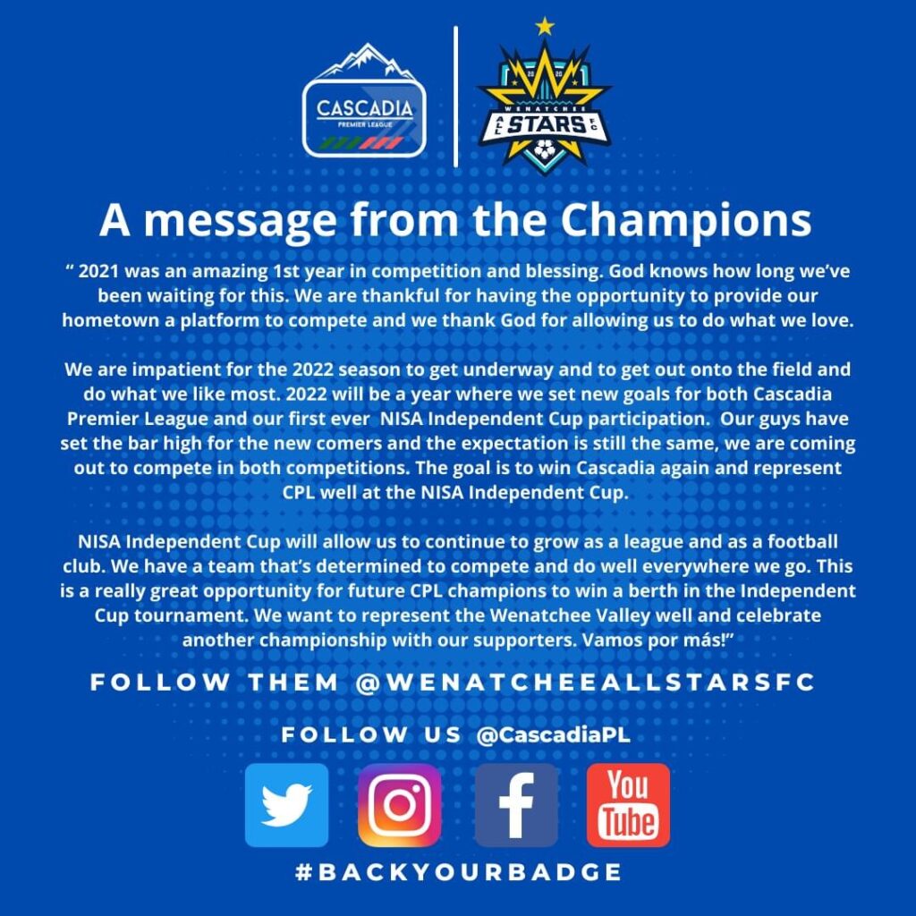 We are impatient for the 2022 season to get underway and to get out onto the field and do what we like most. 2022 will be a year where we set new goals for both Cascadia Premier League and our first ever NISA Independent Cup participation. Our guys have set the bar high for the new comers and the expectation is still the same, we are coming out to compete in both competitions. The goal is to win Cascadia again and represent CPL well at the NISA Independent Cup.